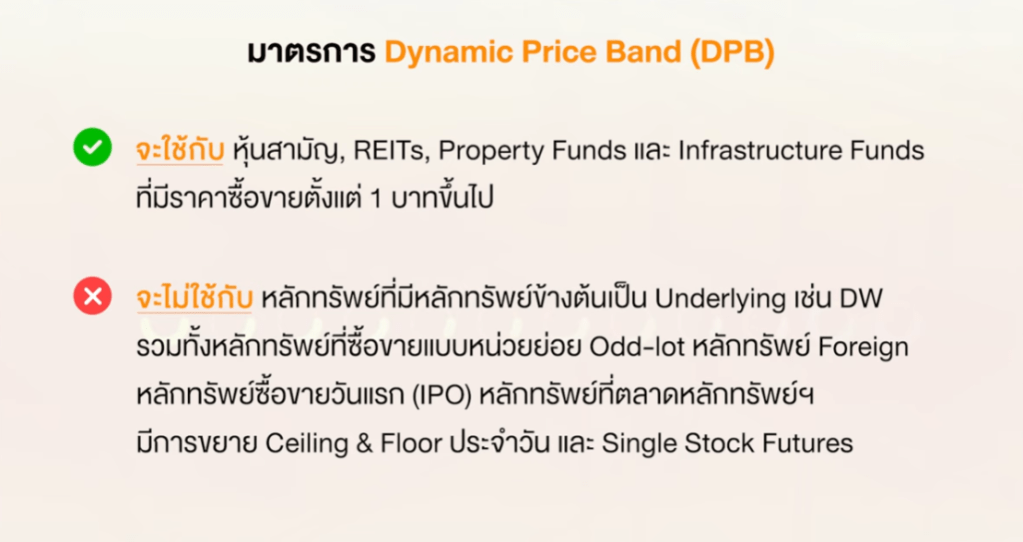 - เพิ่มเสถียรภาพของตลาด: โดยเฉพาะในช่วงที่ข่าวสารหรืออารมณ์ตลาดรุนแรง การมีกรอบราคาแบบ DPB ทำให้ตลาดเคลื่อนไหวอย่างมีเหตุผลมากขึ้น หุ้นจะเคลื่อนช้าลง(ทั้งขึ้น และ ลง)