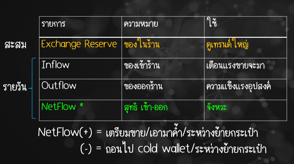 สรุป ก็คือ Reserve เหมาะกับการดู “โครงสร้างระยะยาว” ว่าเหรียญอยู่บนกระดานมาก–น้อยแค่ไหน ส่วน Netflow เหมาะกับการดู “ความเสี่ยงระยะสั้น” โดยเฉพาะช่วงราคาผันผวน