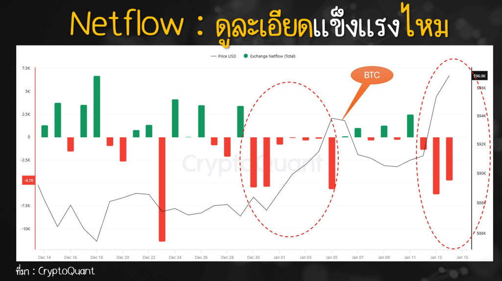 ถ้า Netflow เป็นบวกมาก ๆ ในจังหวะที่ราคา “วิ่งแรง” ก็ต้องระวังว่าอาจมีคนเอาเหรียญมาวาง “รอขายทำกำไร” เพิ่มขึ้น
