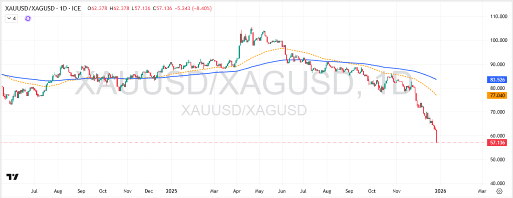 • Ratio ยิ่งต่ำ = เงินยิ่งวิ่งแรงกว่าทอง (คือเงิน “แข็ง” เปรียบเทียบกับทอง)