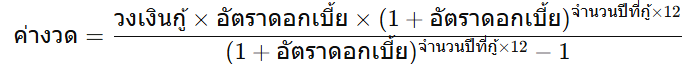 - ตัวอย่าง: กู้ 3 ล้านบาท ดอกเบี้ย 6% ต่อปี ระยะเวลา 30 ปี จะมีค่างวดประมาณ 18,000 บาท/เดือน เป็นต้น